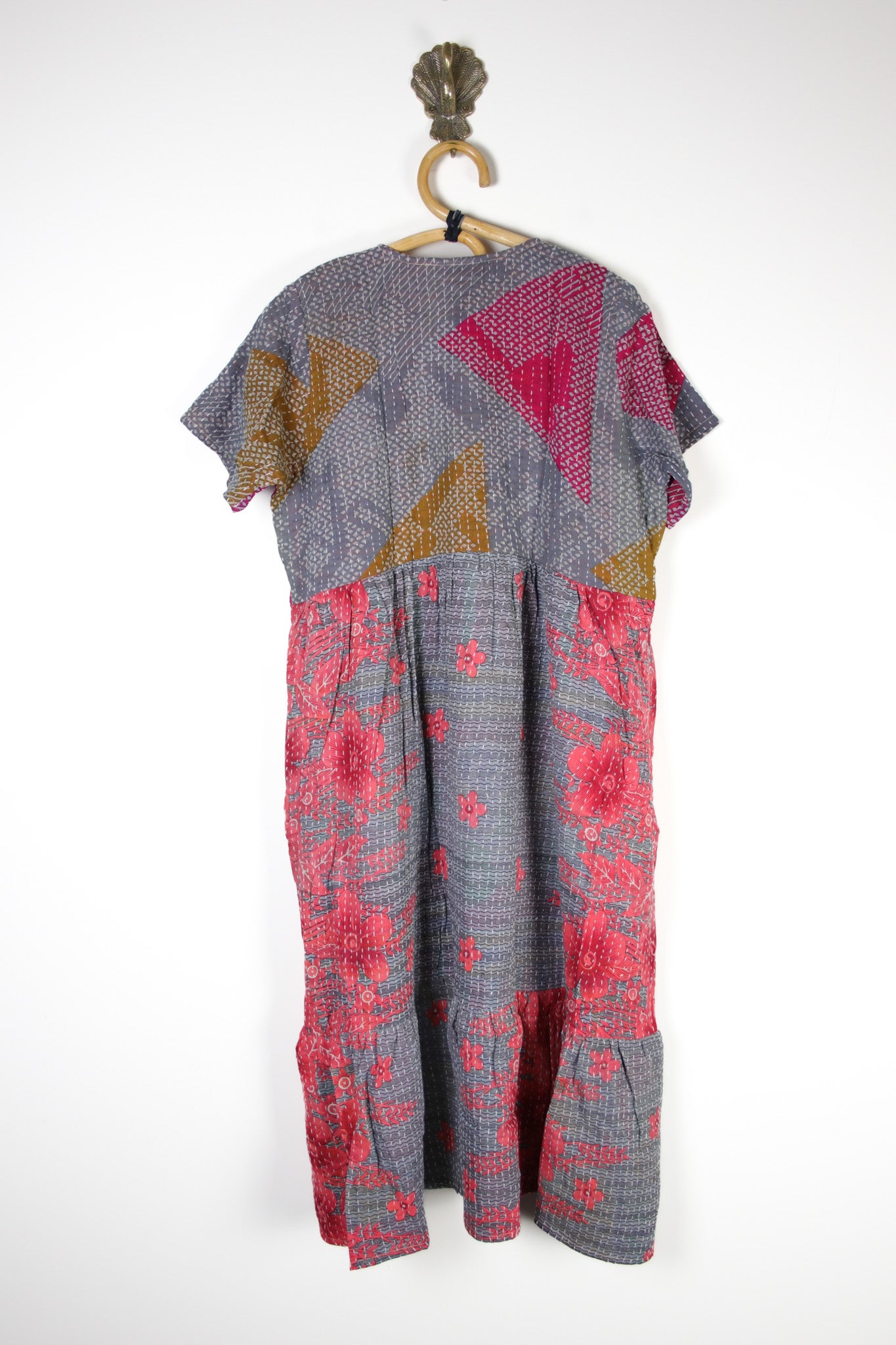 Our Saheli Dress is crafted from two perfectly mismatched Indian cotton kantha fabrics, each dress is truly one of a kind.